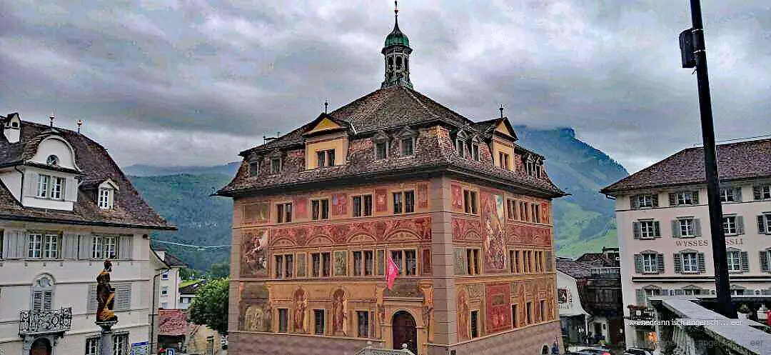 Nach em Zmittag luege mer das Schwyz no chley a. Näbe viu nöie Hüser (g’schackvouer aus z Emmette) git es sogar es paar auti. G’schicht u wi me se versteit, wird da sogar ar Fassade zelebriert.