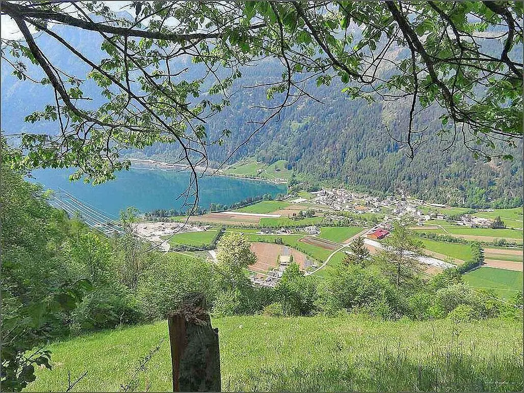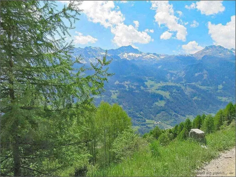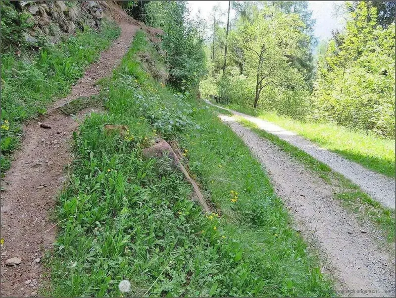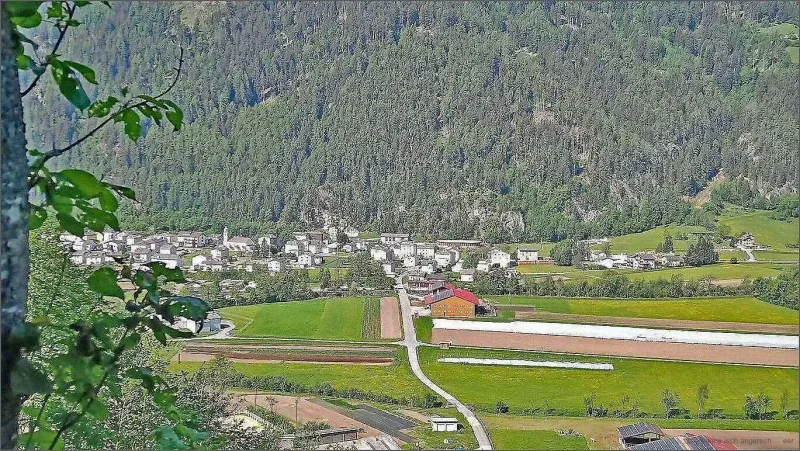 Mi Route füehrt mi der Bärg düruf bis unger Sculpetoir. Vo dert geit es gäge Norde, um Salina ume gäge Doss. O hie wird b’boue:- es isch aber o schön hie, das muess me säge! Vo da geit es wyter gäge Belégna, de geit es gäge Galiell, Vendület u de wieder ache gäg Cantone. Huiii, die Näme! U die Höger u Abhäng! U miner Chnöi u Wade!
