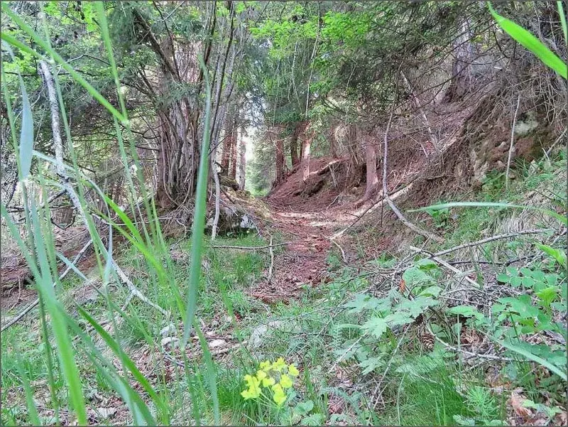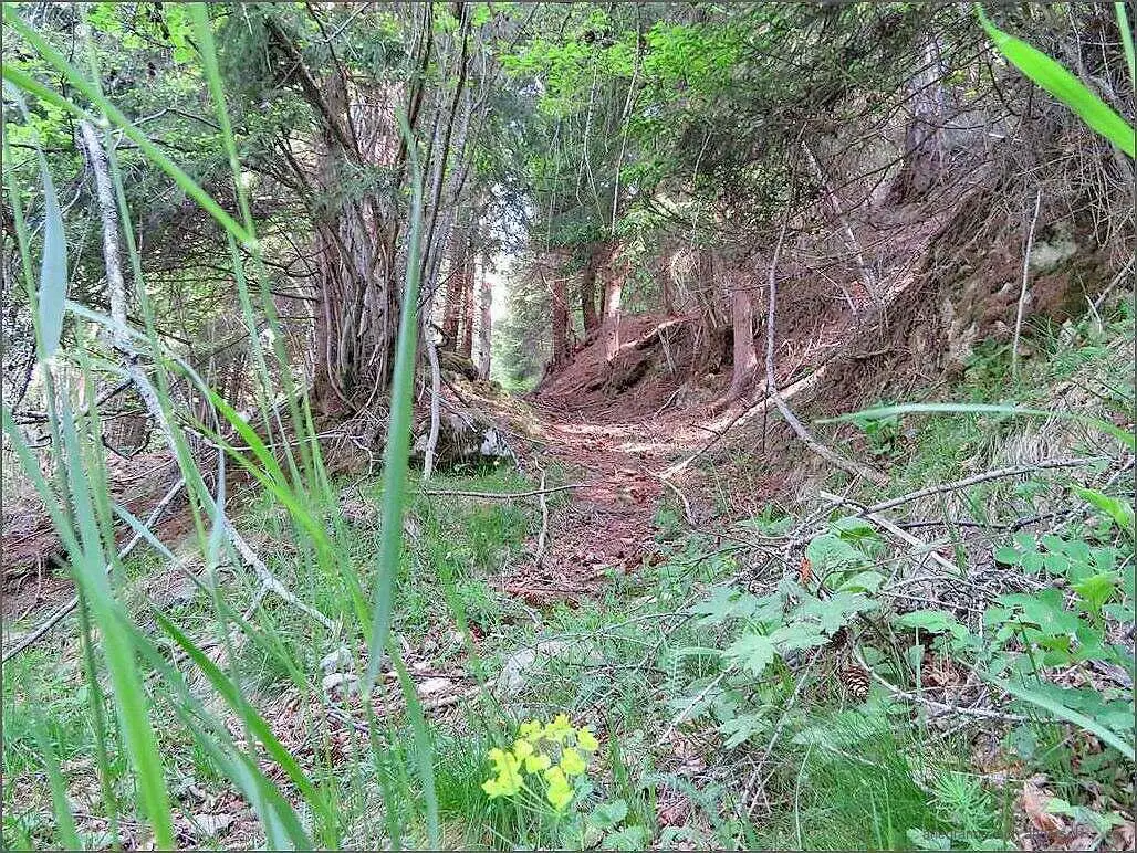 Grad dert, wo der Wäg so befeschtiget isch worde frage mi scho, vo wäm u für was. So wie s usg’seht, si die Wäge alt u scho mänge Hirt isch da mit der Herde düredonneret. We n i aber obe luege, de si d Matte früecher grösser g’sy. Me g’seht’s o de Hüttene a. Die stöh zum Teil hüt zmitts im Wald. ( U wärde no dert zu Feriehüsli umb’boue.) Dä Hang, ömu wyter obe, isch mit Fahrsträssli erschlosse u us de Alphüttene wärde Wucheänddomizil.
