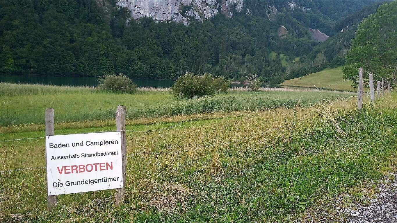 Aber nach drühundert Meter isch o wieder es Verbot. (Ds Manndli, wo n ig de speter triffe, verzellt vo wildem Cämpiere u äbesettigem Bade … de müess me doch sperre.) Auso de zrügg u wieder der Hang nah obsi.