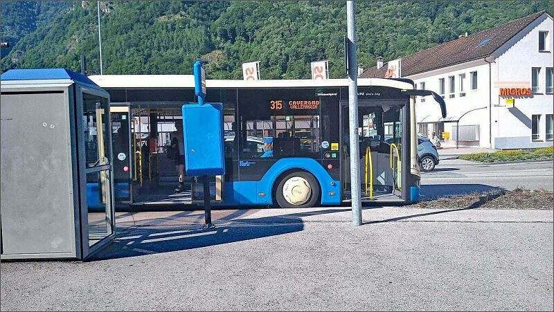 Am sibzäh ab nüni bi n ig hüt Morge hie a cho. Hie heisst in Maggia centro ubmit em Poschtouto. (das funktioniert übrigens grossartig u isch für mi gratis) Dernah bi n i vou Tatedrang losg’schuehnet. Mis Ziel isch eigetli der Giro del Salto, aber i lande bim Wasserfall.