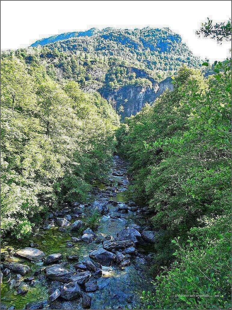 Z hinderscht im Tal wächslet me d Talsite u chunnt natürli em Fluss sehr nach. Es wär wunderbar idyllisch und o toll zum Bade. Wil aber irgendwo obe es Stouwehr isch, wo Wasser ablaht, isch das viel z g’fährlig, verbote u es wird g’warnet dervor.