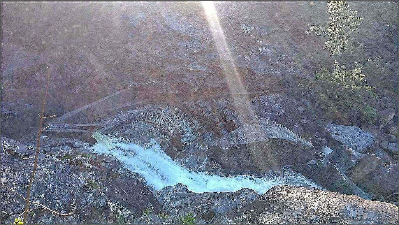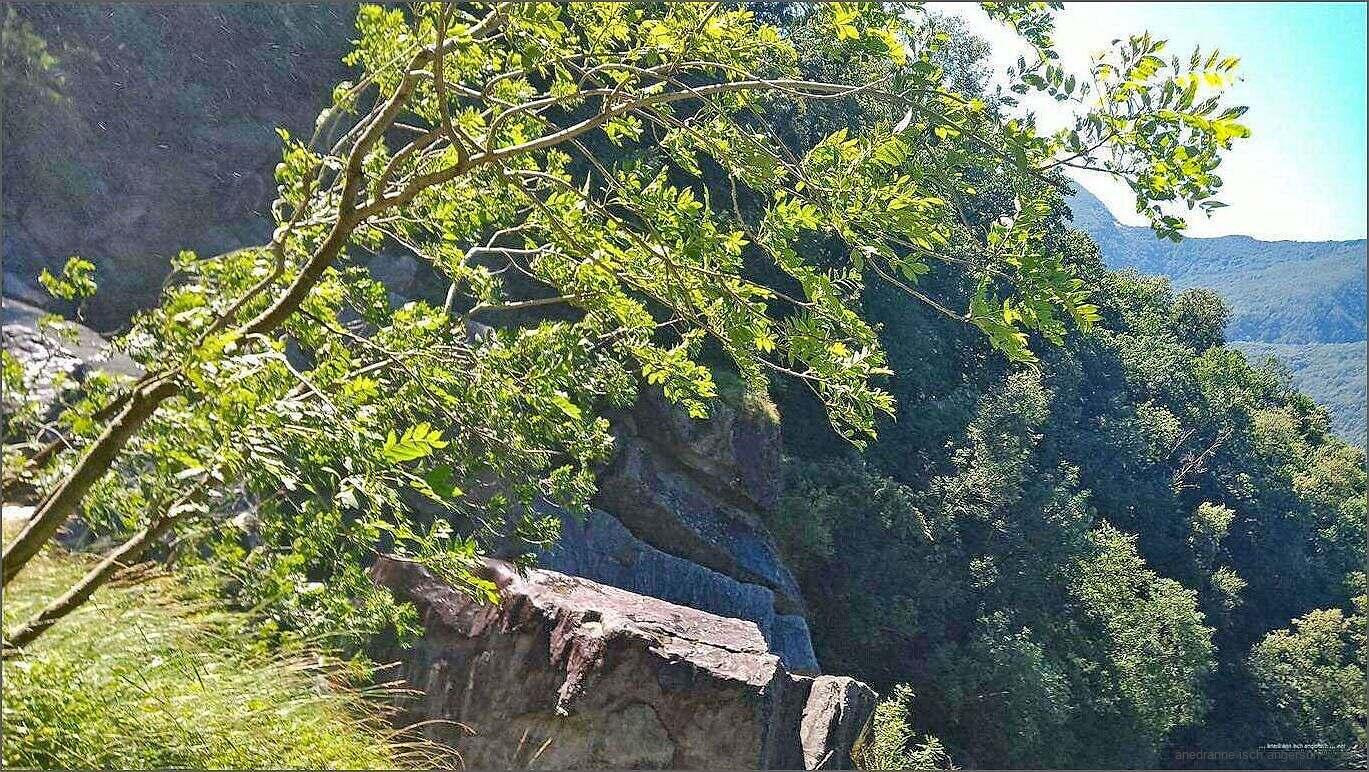 Am sibzäh ab nüni bi n ig hüt Morge hie a cho. Hie heisst in Maggia centro ubmit em Poschtouto. (das funktioniert übrigens grossartig u isch für mi gratis) Dernah bi n i vou Tatedrang losg’schuehnet. Mis Ziel isch eigetli der Giro del Salto, aber i lande bim Wasserfall.