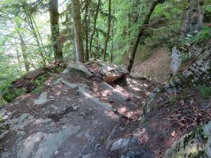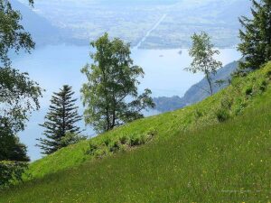 Nu, – es fahrt. Bis ueche zum Beizli Weid, wo o alles mit Sälbschtbedienig louft. Lüt si äbe tüür, o hie! Nach me Kafi loufe n i nidsi. Es isch teilwys (mooremässig) steil u rütschig. I ha zwar die höche Schueh anne, aber d Stäcke ha n i grosszügig im Hotäl g’lah.