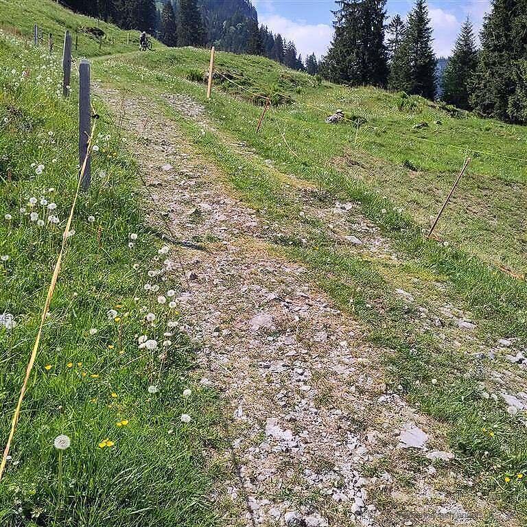 Lang triffe n i niemer. Öppe so by ‚Eggerüti‘ änderet sech das. Der Alpwäg isch usb’boue worde ( äuä ersch dä Früehlig). Es g’seht ganz strub us. Zwar isch bis itz nume e Steibelag, – öb das ächt wird länge? Die a g’sprocheni Chundschaft si d Biker. Vo dene het es scho ganz viel da, – eifachi Velo suecht mer vergäbe. Es si Supermaschine wo g’fahre wärde, viel mit Motorungerstützig u Kabong’stell … Wird das der Ersatzsport hie? Es wird ömu grandios a g’richtet.