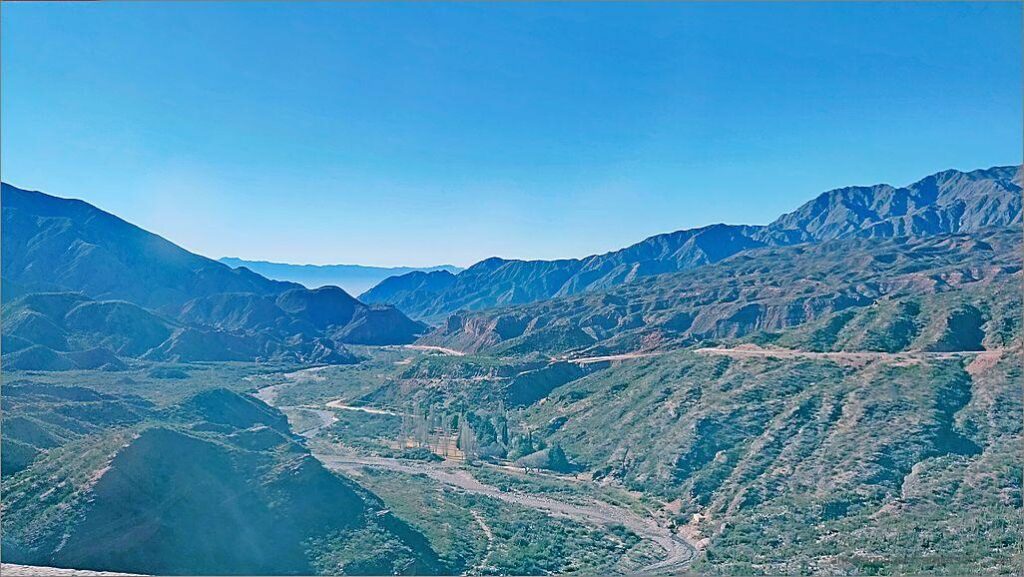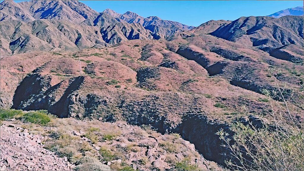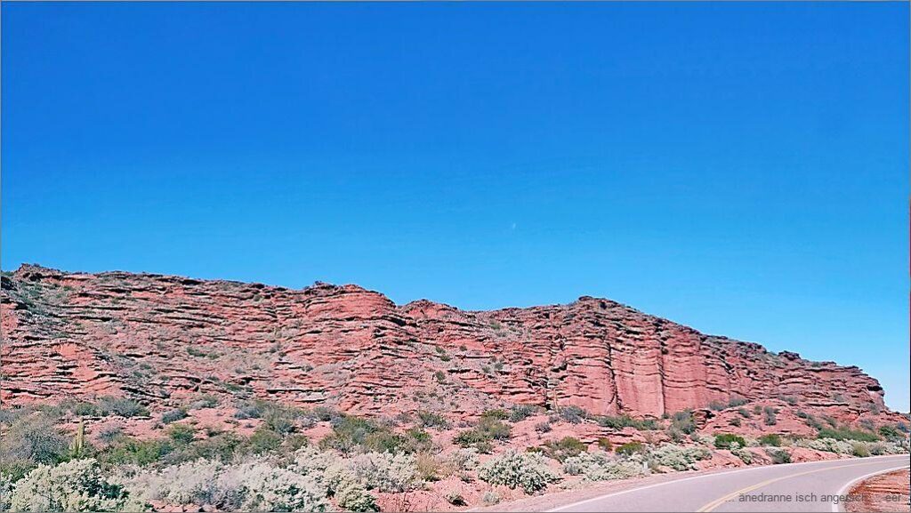 Vo Chilecito fahte mer lang na de zähne los. D Sunne wärmt mitlerwile scho rächt. Mer frese dür Äbene mit ‚Struchwüeschi‘. Zwüschedüre queere mer grossi, uszröchneti Flusslöif. Ab Sonagasta si mer i re Bärgwält vo luter rote, verwitterete Felse. Vereinzelt het es Äbene wie im Altiplano. In Pagancillo finge mer ds Reschturant El Diego. Hie ässe mer z Mittag. Ig ha Ricottaravioli, wo sehr guet si.
