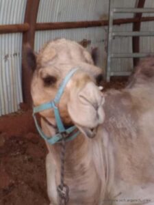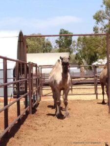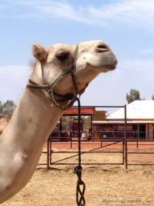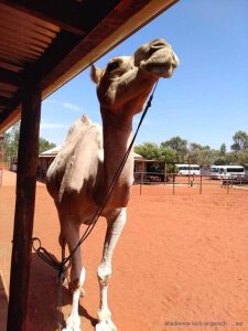 Fast hätten wir uns verschlafen! Schon vor fünf beginnt der grosse Auszug im Ayers Rock Campground, alle wollen ’sunrisen‘ beim Uluru. Das bringt ziemlichen Lärm und ich dreh mich noch mal. – 😴 Dann ist es Viertel nach sechs und der Morgen beginnt. 😙 Mit dem Abbau und Zusammenpacken wird es Viertel vor zehn, bis wir den Zeltplatz verlassen. Wir gehen zu Saskia das ist eine Schweizerin, die hier in Yulara auf einem Kamelhof lebt. Wie sich herausstellt, ist dieser Hof ein riesiger Betrieb, ein Unternehmen mit einigen Angestellten.. Kamele werden in der Wildnis eingefangen und zum Reittier umgwöhnt. Gegenwärtig sind dies rund siebzig Tiere. Ausserdem hat es knapp dreissig noch scheue, nicht reitbare. Jetzt, im Januar, sind hier nicht viele Touristen. Trotzdem ist andauernd Betrieb und Gruppen reiten aus. Saskia erklärt und lehrt uns viel. Sie nimmt sich Zeit und geht auf unsere Fragen ein.