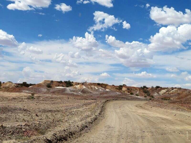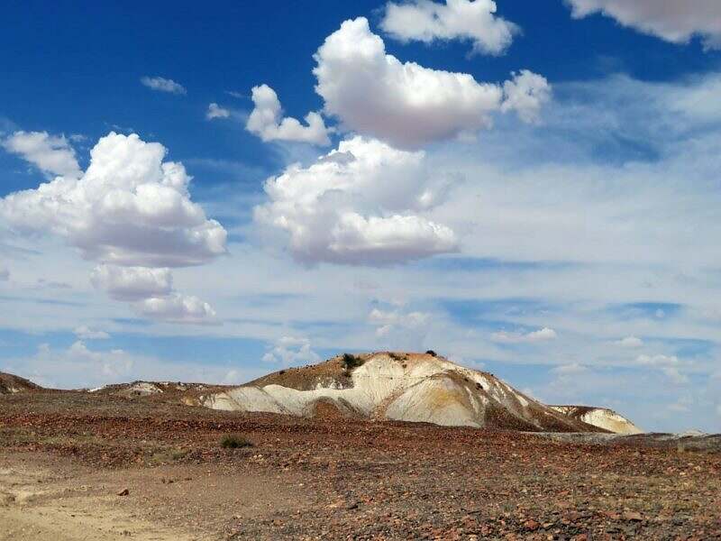 Um zwölf erreichen wir Arckaringa Hills. Painted Desert ist hier wörtlich zu nehmen. Die Berge und Hügel sind rot, braun, weiss, gelb, schwarz, grünlich und bläulich, wie eben die Erze und Oxyde in den Steinen vorgeben.