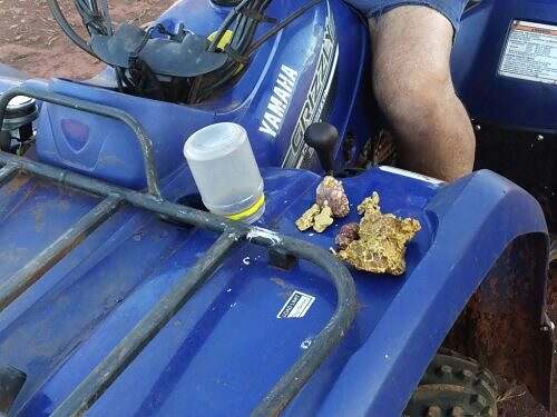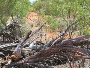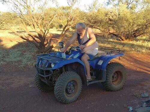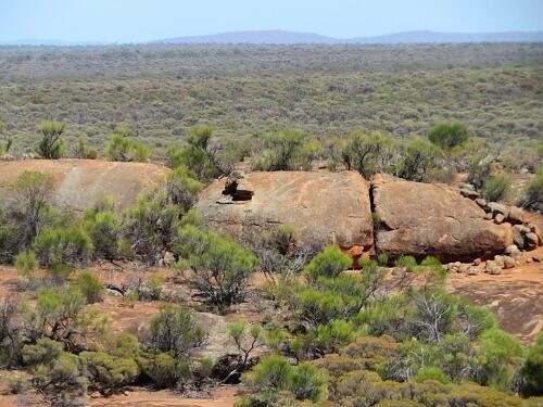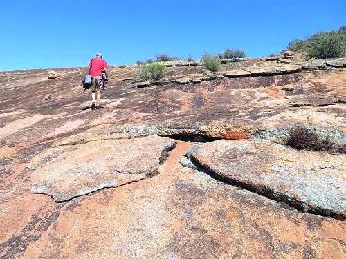 Sechs Uhr morgens: «is someone awake here»? Mr. Bell fährt mit seinem Quad vor und weckt uns. Er ist gekommen, um uns Goldnuggets zu zeigen, die er gefunden hat. Arm ist er nicht. Nach längerem Gespräch zieht er wieder ab. Wir packen zusammen, frühstücken etwas und machen uns um acht Uhr auf, Richtung Warrdagga. Dies ist ein etwa 380 Meter hoher Berg, ähnlich dem Uluru. Herr Bell hat uns den Weg über sein Land erklärt, nebenbei er ist Besitzer von 2700ha Farmland. Kilometer um Kilometer fahren wir auf schnurgeraden Pisten durch den Busch.