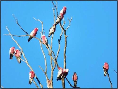 8 Wakefield Rd, Leasingham SA 5452, Australien | 21°CRosa Kakadus sind sehr schöne Vögel. Ich liebe sie vom Aussehen her und beim Fliegen sind sie wahre Meister. Wenn es aber um ihre Laute geht, hört meine Begeisterung auf. Einer alleine mag ja noch gehen, unsere rosa Freunde pflegen aber in Schwärmen zu fliegen. Sobald das Tageslicht sich zeigt, beginnt das Konzert, und sie ’singen‘ bis lang in den Tag hinein. Die letzten Morgen wurden wir so in den Tag gekrächzt, mit einer Ausdauer und Begeisterung, wie sie nur ein rosa Kakadu verstehen kann. 😡