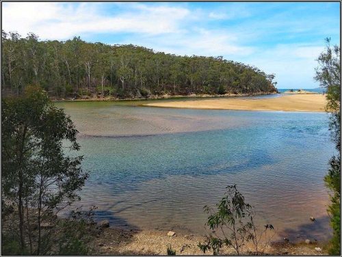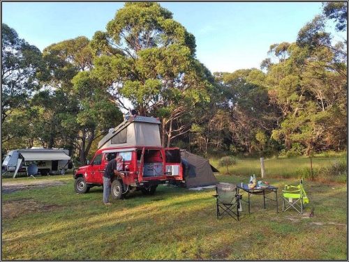3388 Tathra-Bermagui Rd, Barragga Bay NSW 2546, Australien | 25°C Halb sieben, ich erwache in einer idyllischen Waldlichtung, auf der knapp ein Dutzend andere Camper und Wohnwagen stehen. Es ist Zeit für das Frühstück. Wieviel angenehmer ist es doch, wenn um diese Zeit die Sonne schon aufgegangen ist und absolut keine Wolken im Anzug sind. 😊 Wir geniessen den Morgen und lassen die Sonne das Zelt vollständig trocknen. Heinz imprägniert es erneut.