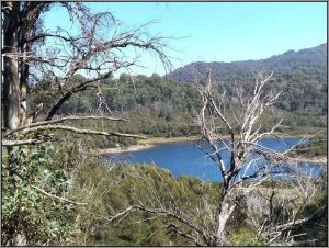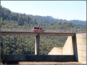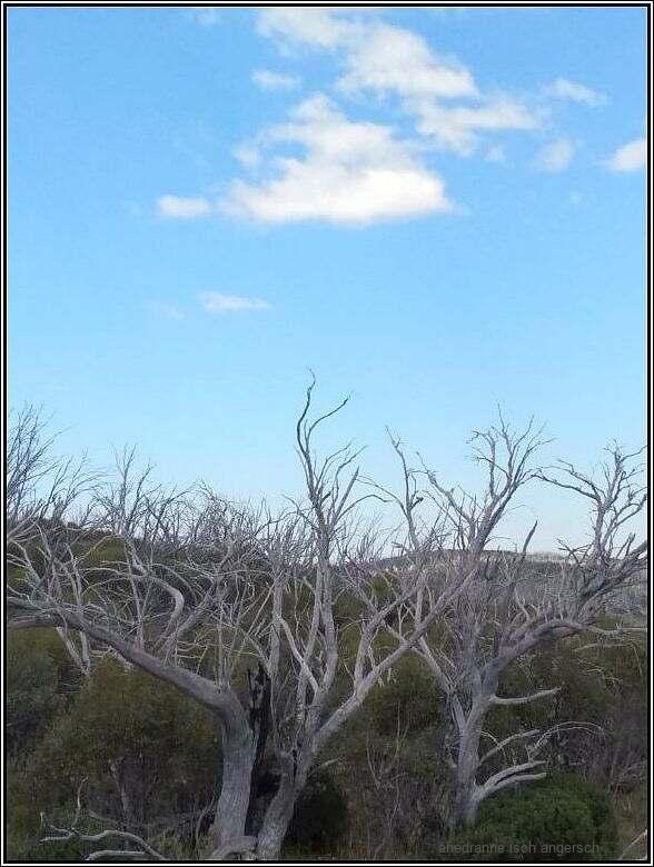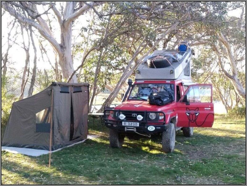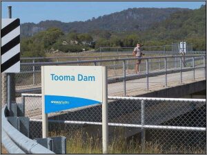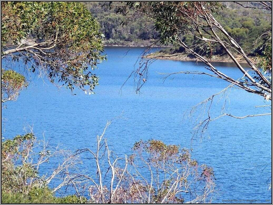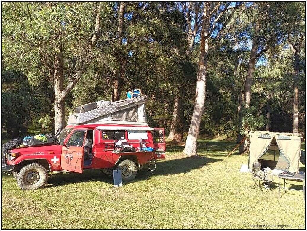 Beim Frühstück beschliesst Heinze Gold zu waschen 😉. Aber so Ernst ist es ihm dann doch nicht. Eigentlich müssten wir noch was mit den Prospektor-Zertifikaten machen. Bisher haben sie uns nur Unkosten verursacht. Wir sind also in Stacys Bridge übernachtet. Mitten im Wald, an einer recht grossen Strasse. Aus diesem Grunde will heute die Sonne fast nicht zu uns vordringen. Und kühl ist es auch, wir sind schliesslich in den Bergen. Das Reserverad hat sich wieder abgesenkt auf der gesterigen Rüttelpiste. Daher schleift die Halterung wieder auf dem Schwellenblech. Heinze muss flicken. Trotzdem sind wir gegen elf schon fast auf Piste.Vorher machen wir noch einen Ausflug zum nahen Flüsschen. Gold waschen wir zwar keines und dem Fluss entlang kommen wir auch nicht recht voran. So kehren wir bald wieder zur Strasse zurück. Nun ist diese wieder geteert Heinze kann dem Kamel endlich etwas ‚die Sporen‘ geben. In Corryong essen wir zu Mittag. Das Angebot für Vegetarier ist schmal. Eine Magnum als Dessert wertet das Ganze etwas auf. Heinze muss wieder Büro machen und bleibt im Restaurant. Ich gehe in die IGA, dem lokalen Supermarkt, um einzukaufen. Wir fahren in den Kosciuszko National Park. Die Tooma Road bringt uns in luftige Höhen, am höchsten Punkt sind wir auf 1600 Meter über Meer. Verkehr hat es fast keinen mehr. Die Telefone funktionieren auch nicht mehr, von Internet ganz zu schweigen. Beim Weiterfahren landen wir auf der Snow Ridge Road. Hier halten wir, weil wir das prächtige Panorama festhalten wollen. Plötzlich werden wir von einem Hiace überholt und dieser hält vor uns. Die Frau, die aussteigt heisst Therese und kommt ursprünglich aus Uetendorf. Sie interessiert sich, was ein Auto mit BE-Kennzeichen in Australien mache. Heinze erzählt ihr die ganze Geschichte. Auch sie erzählt von ihrem Weg nach Australien, den sie vor über vierzig Jahren eingeschlagen hat und seither nun Down Under lebt. Heute ist sie unterwegs zu einer Chorprobe, wofür sie mit dem Auto mehr als tausend Kilometer gesamthaft zurücklegt. 🤔 Australische Verhältnisse halt! Bald nach dieser interessanten Begegnung sind wir in Cabramurra. Hier zweigen wir Richtung Cooma ab um bald darauf im Three Mile Dam Camping zu landen. Hier verbringen wir die Nacht am Seelein.