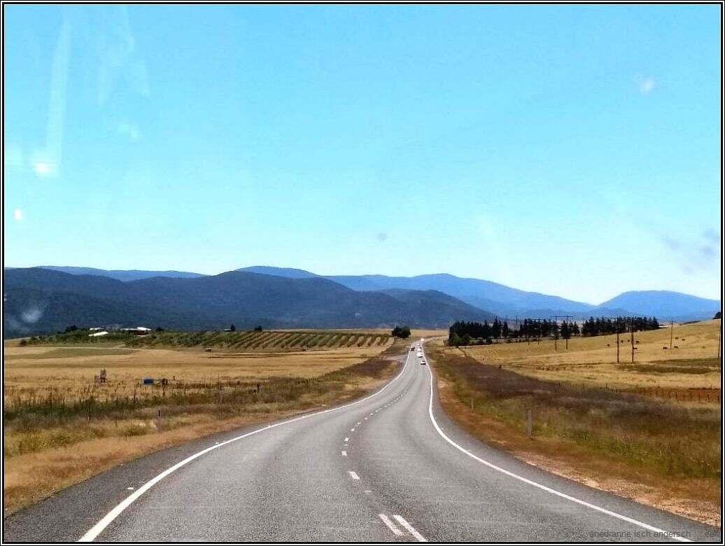 Es ist zwanzig vor elf wie wir vom Camping losfahren. Die Umgebung hier ähnelt einer Hochebene, begrenzt durch grosse Hügel.