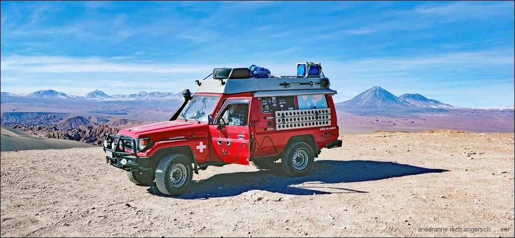 Vo dert fahre mer zrügg bis San Pedro de Atacama. I der Ungerkunft mache mer zersch ‚Büro‘, später ‚berchunnt ds Kamel e Dusche (u mir es Kafi) u am Schluss göh mer gah ässe. Heinze blibt no chley ir Stadt u ig gah zrügg i ds Hostel.