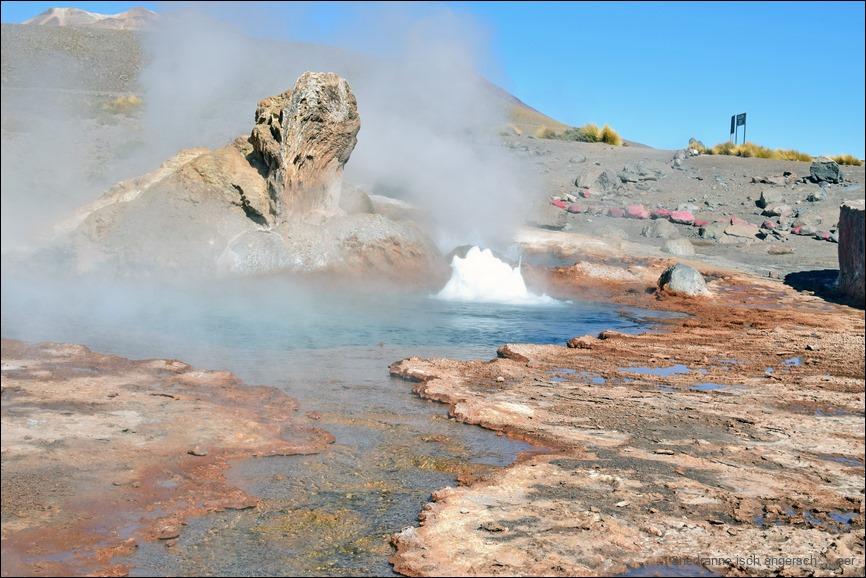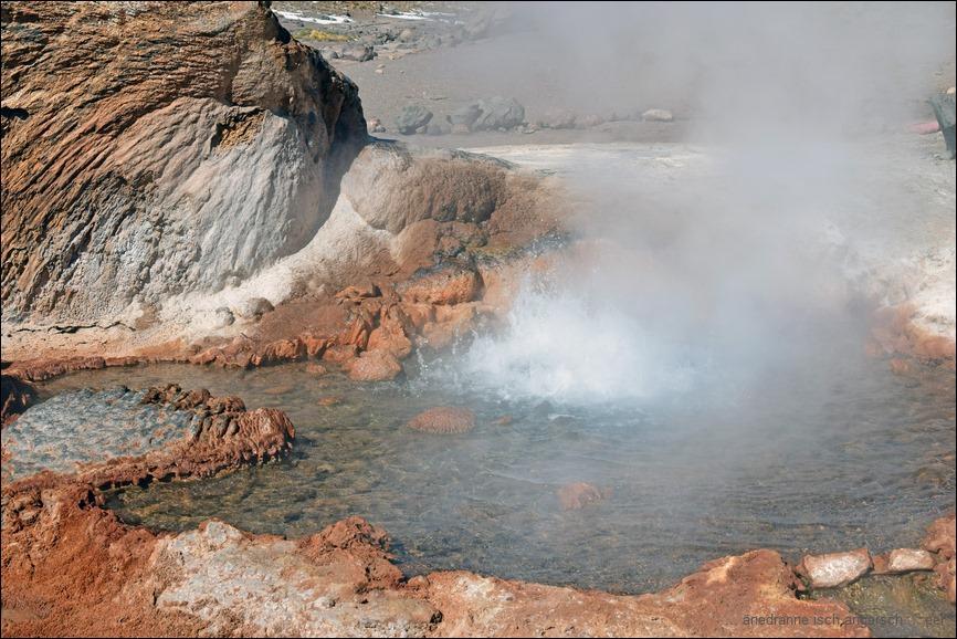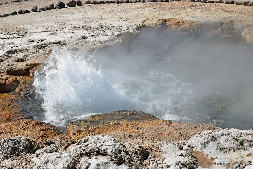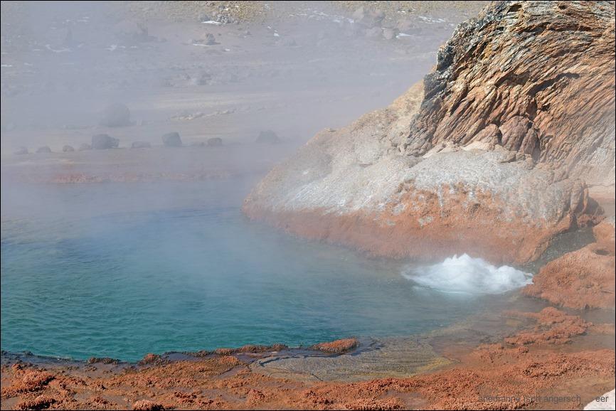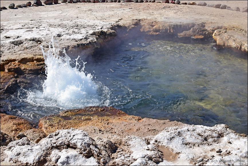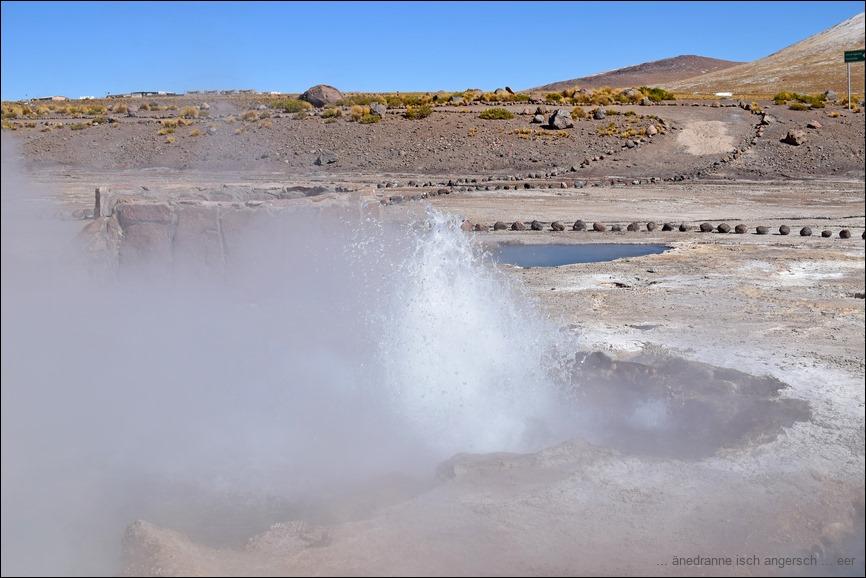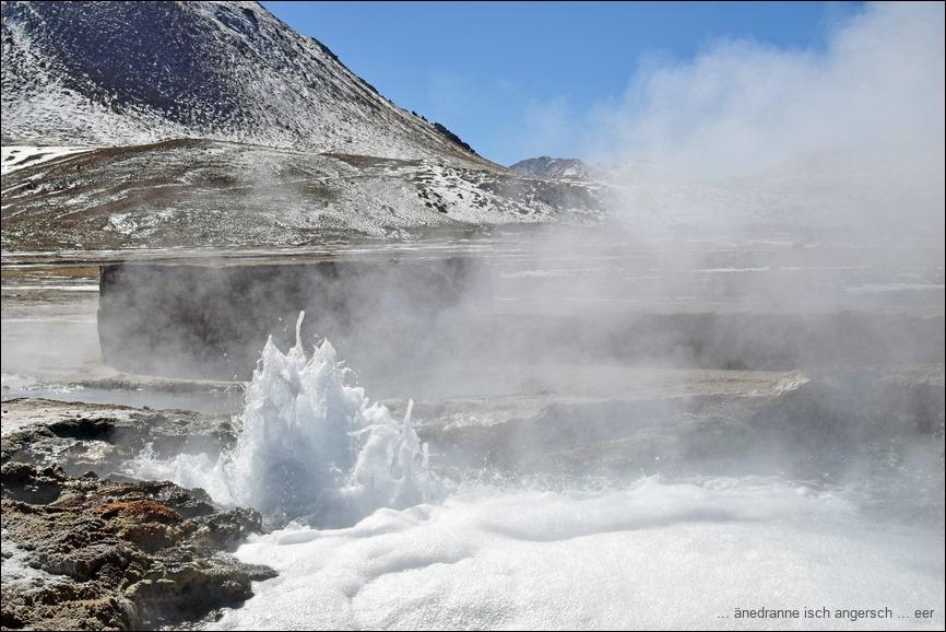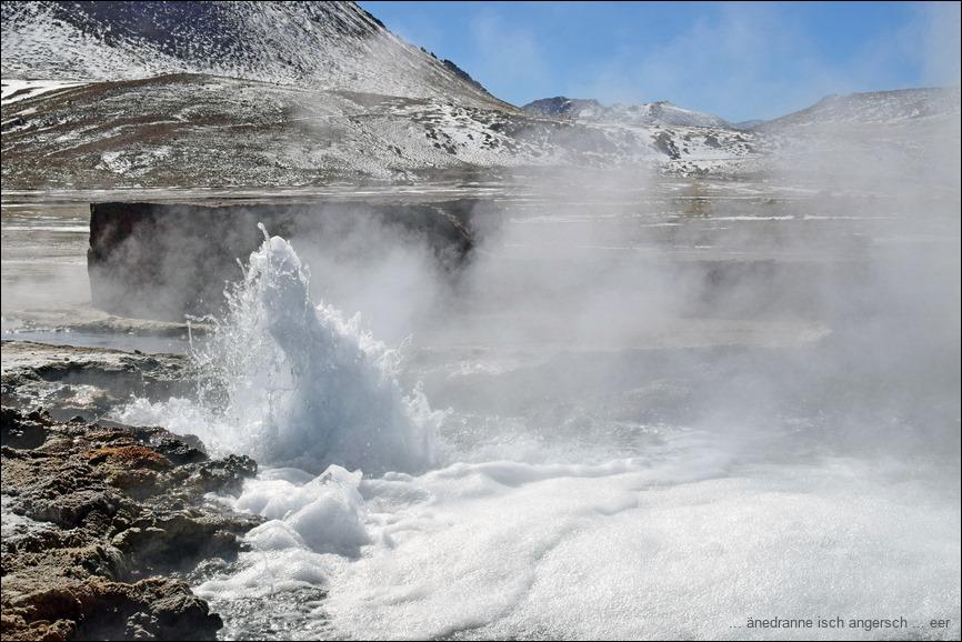 Üsi Erwartige si also nid so wahnsinnig. Es isch nah de eis u mer si witgehend allei i dere Äbeni. Es macht de aber doch Idruck, we’s us jedem Loch im Bode gurglet u dampfet. Einzelni Fontäne erreiche de trotzdäm e Höchi vo über me Meter. Was da im Ungergrund vor sech geit cha me nume ahne. Me tuet guet dra, die Wässerli nid z berüehre, die choche mit meh als hundert Grad.