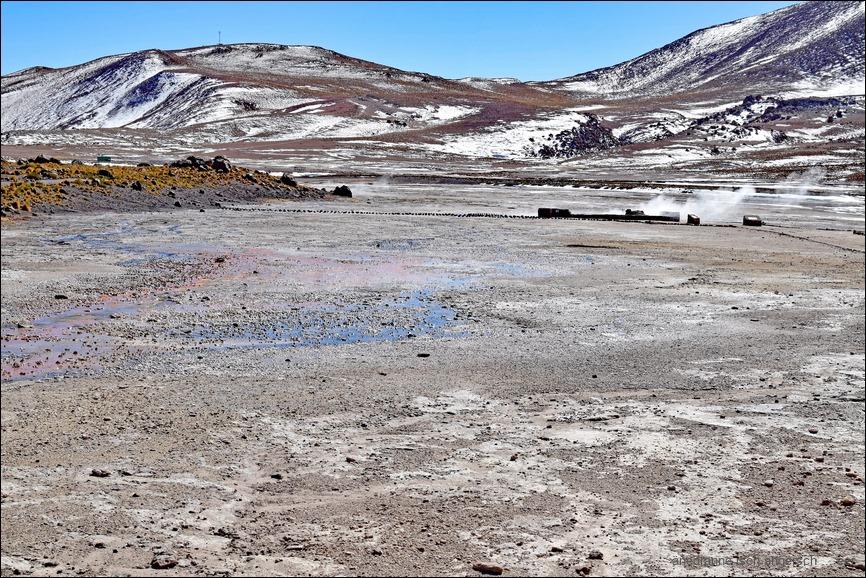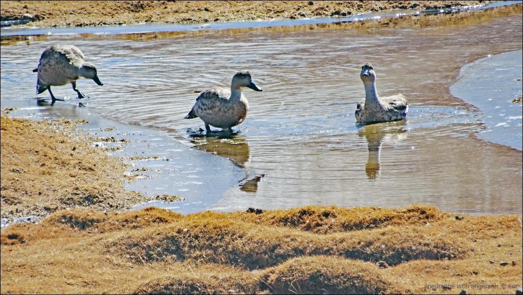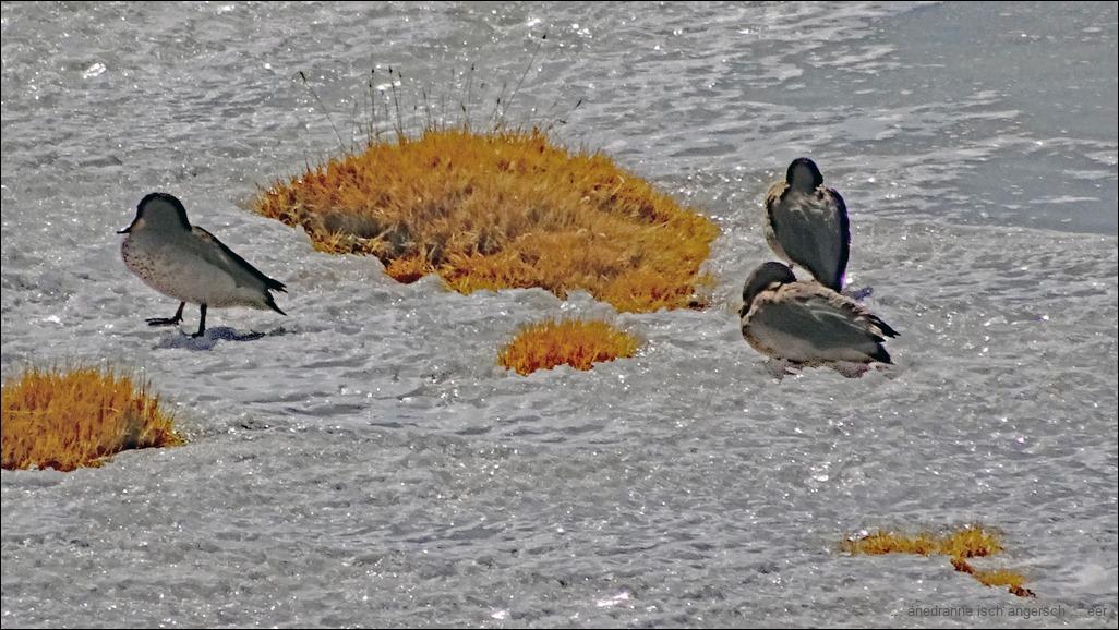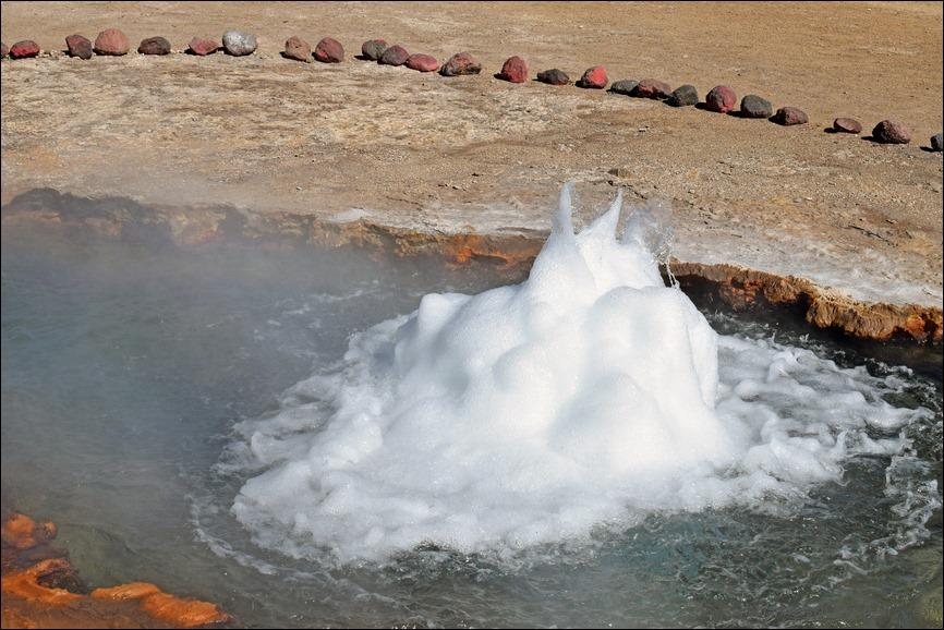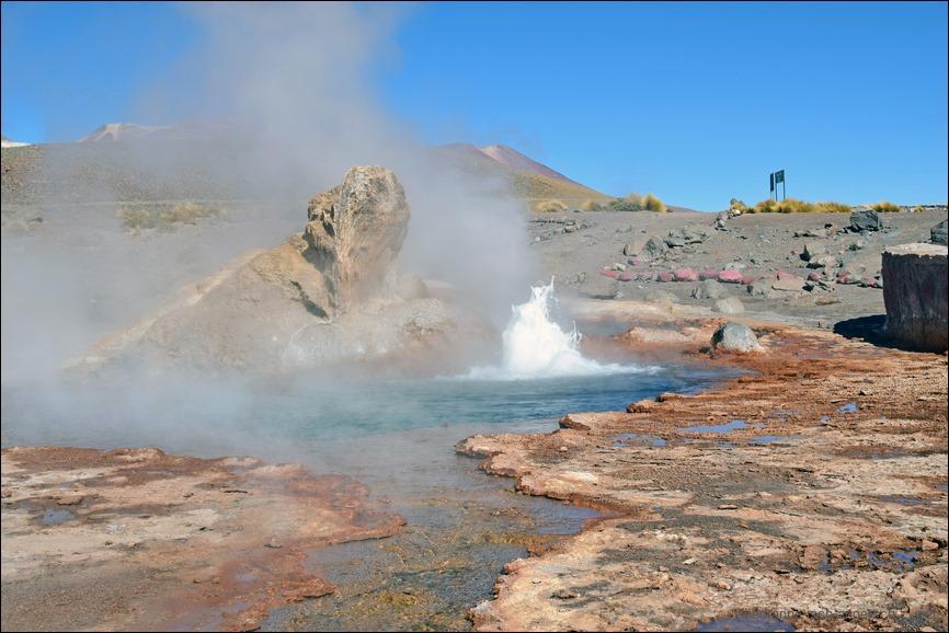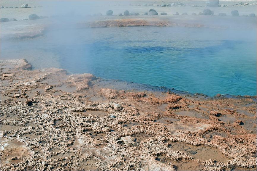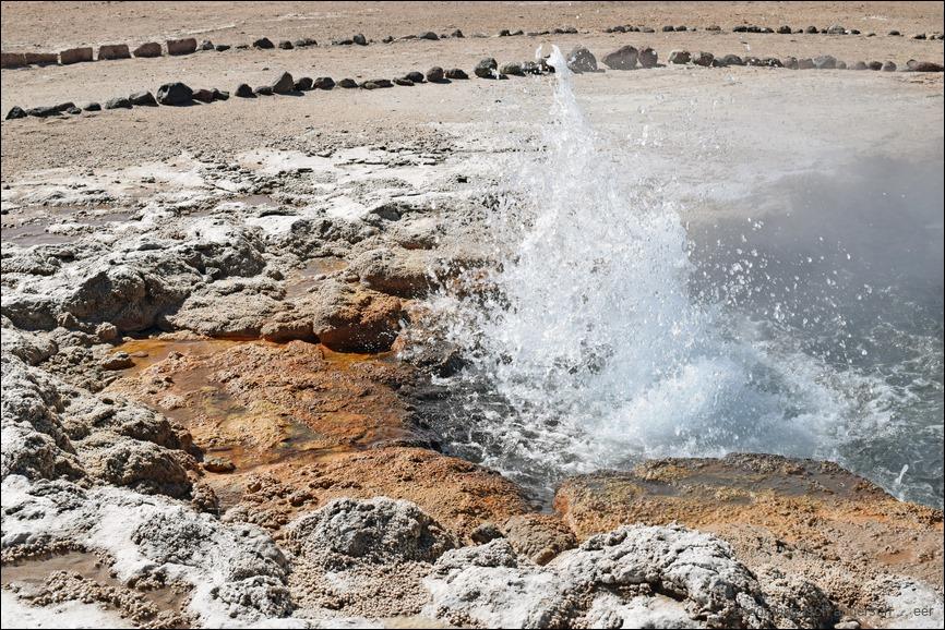Üsi Erwartige si also nid so wahnsinnig. Es isch nah de eis u mer si witgehend allei i dere Äbeni. Es macht de aber doch Idruck, we’s us jedem Loch im Bode gurglet u dampfet. Einzelni Fontäne erreiche de trotzdäm e Höchi vo über me Meter. Was da im Ungergrund vor sech geit cha me nume ahne. Me tuet guet dra, die Wässerli nid z berüehre, die choche mit meh als hundert Grad.