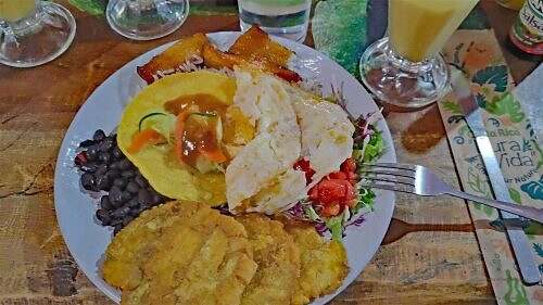 I der ‚Cocina de mi Pueblo‘ chehre mer zum Zmittag i. Das isch e Beiz mit typischem Ässe. Es isch eifach, aber guet. I berchume mi vegetarisch Täller.