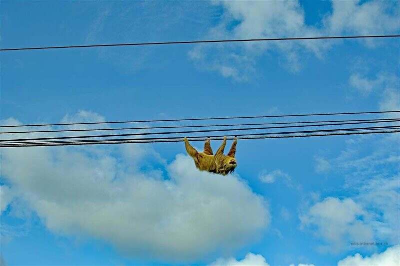 Na me chlyne Spaziergang im Urwald hinger der Beiz (mit pflegte Chiswägli) g’geeit es mit em Bus wyter. Irgendeinisch bewegt sech es Fuultierä a de Telefonleitige em Strasserand nah. Zwöifingerfuultier! Das git de grad chlei e Stou uf der Strass.