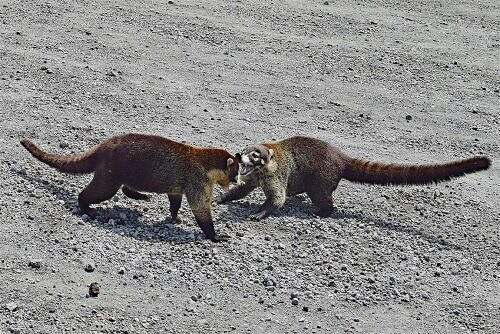 Der Abstieg mache mer individuell dür Waldwäge, was no so idrücklech isch. I g’seh e ganzi Mängi Tier ungerwägs i däm Blettermeer. Ganz zungerscht wirde n i vo zwe Naseebäre überrascht, wo mitenang es Kämpfli us z fächte hei. Zäme springe si uf mi zue, fuuche, brüele u biisse; – es schiint ärnschter z sii. So zwe Meter vor mir zueche halte si, de het der eint g’nue u zieht sech zrügg.