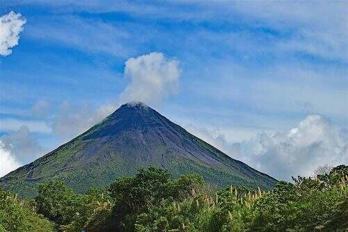 Der Arenal isch e aktive Vulkan. Der letscht Usbruch isch 2003 g’sy. (uf em Föteli g’seht me links, näb de Wulche es Röichli). Är chönnt also jederzyt wieder usbräche. Drum dörfe d Tourischte nid ueche u der Krater aluege (o we eim das g’luschtet). Drohne si o verbote.