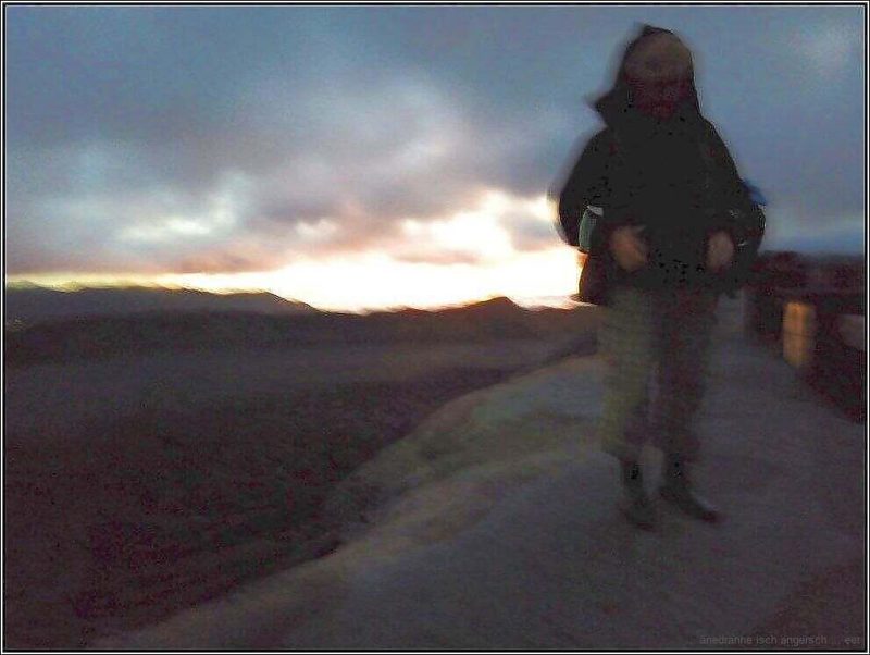 Heute kräht der Hahn schon früh beim Kamel. Edi klagt über die Schweinekälte und schwört sich, eine Decke zu kaufen. Im Dunkeln machen wir uns auf den Aufstieg auf den Bromo. Mit dem Aufstieg über die Steintreppe hebt sich auch die Sonne. Ein einmaliges Bild, wie die Ebene der Caldera nach und nach erhellt wird.
