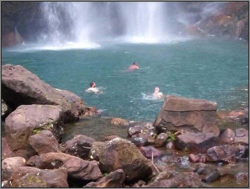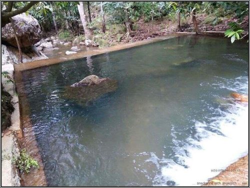 … nicht unbedingt das beste Schuhwerk sind. Nach gut einer Stunde sind wir bei der Prallzone, einem Wasserbecken von beachtlicher Grösse. Ein beeindruckender, grosser und schöner Wasserfall ist der Cunco Rami, – einzelnen ein Bad wert. Danach beginnt der Wiederaufstieg. Eine mühsame Sache mit dem falschen Schuhwerk, Durst, knurrendem Magen und einer Sonne, die auf den Kopf brennt. Nach der Hälfte der Reisfelder watschelt Edi barfuss und trägt seine Dreckflops in den Händen. Laufen lässt sich damit nicht. Auch den Wald bringt er so hinter sich. Eine Erfahrung der besonderen Art. “Was dich nicht umbringt, …”