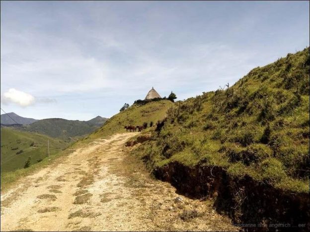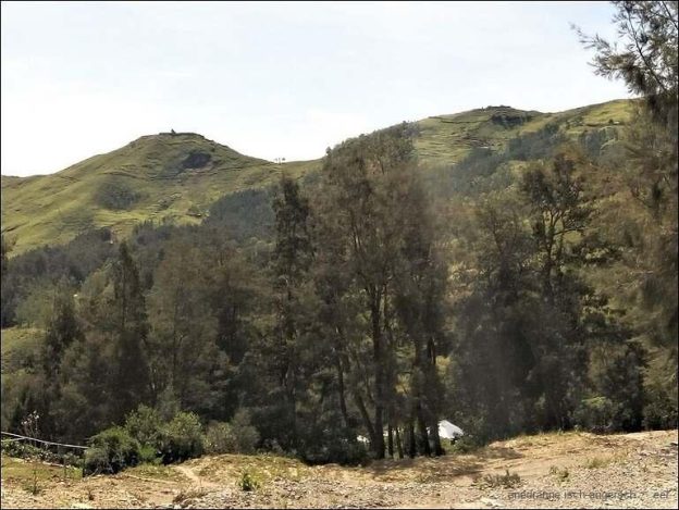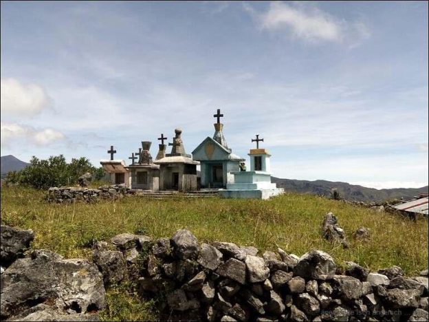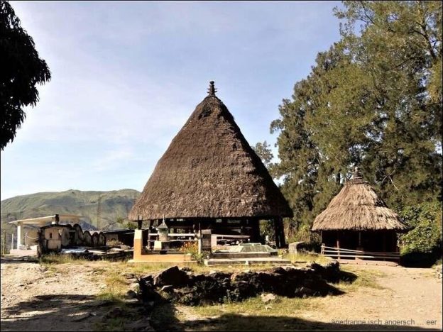 Wir fotografieren noch einige Zeit und fahren dann weiter. Die Strasse ist teilweise wieder ausnehmend gut und wird immer noch ausgebaut. Timor hat zusammen mit China ein Projekt am Laufen. Wir steigen mit der Strasse stetig. In der Nähe von Russulau sind wir zu einer ‘Kultstätte’ aufgestiegen und sind da etwa auf 2050m über Meer. Sicher ist dies der höchste Punkt des heutigen Tages.Diese ‘Kultstätte’ zeugt vom ursprünglichen Glauben auf Timor. Welche Zeremonien, Handlungen und Riten hier verankert sind, weiss ich nicht. Auch die Bedeutung kann uns niemand genau erklären. Unsere Stätte ist zuoberst auf einem Hügel.