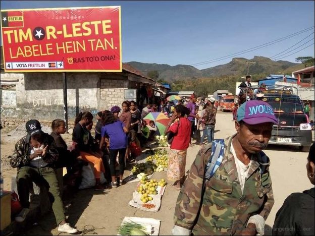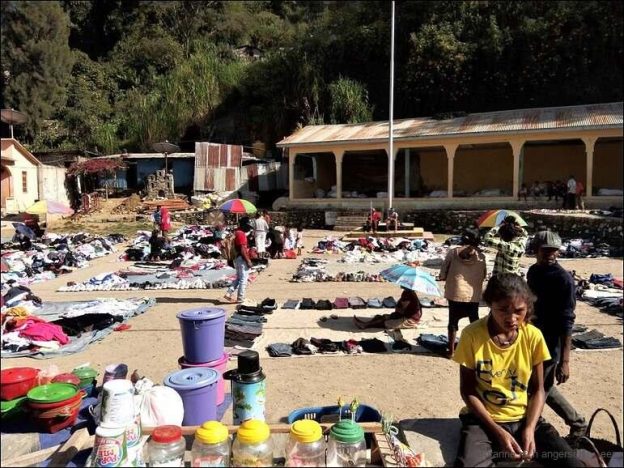 Irgendwo habe ich mal gelesen, dass die Ureinwohner Timors die Kopfjagd zwar auf Druck der Kolonialherren aufgaben, dafür aber die Hahnenkämpfe einführten. Ob da was dran ist, kann ich nicht sagen. Sicher ist, dass eine eher patriarchaische Gesellschaft in Timor Leste lebt, die solche Symbole liebt. Geschäftig sind die Frauen und Mädchen, die Männer und Buben sind oft irgendwo am Rumsitzen, Diskutieren, Bluffen und Rumhängen. Ausserdem gibt es wohl keinen Timorer (und aber auch etwelche Timorerinnen) der seinem Spucktrieb alle par Meter freien Lauf lassen muss. Überall wird auf den Boden gespuckt. Hat das auch mit Männlichkeit zu tun? Oder sind das fast alles verhinderte FussballerInnen? Kalt war die letzte Nacht im Kamel und jede Decke höchst willkommen. Dafür war die Luft ungewöhnlich klar. Auch am heutigen Morgen ist die Sicht auf die Landschaft wunderbar. Schade wurde die Nachtruhe sehr oft durch Strassenlärm gestört. Wir gehen ins Warung zum Kaffee und geniessen es. Etwa um neun machen wir uns weiter auf den Weg.