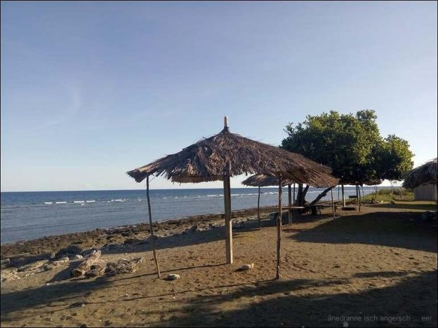 Die ganze Spitze ist mit einer Steinmauer umfasst, darin eine Anzahl Gräber, nun auch mit Kreuz, und ein Rundhaus auf Pfählen in traditioneller Bauweise. Anscheinend gibt es noch viele dieser ‘holy houses’, oder eben ‘Kultstätten’ an verschiedensten Orten. Von nun an führt die Strasse eher wieder runter auf Meereshöhe. Same ist eine Zwischenstation auf unserem Weg. Hier sind wir so um eins und wollen essen und Diesel tanken. Das mit dem Essen gelingt uns in einem unangeschriebenen und unscheinbaren Haus. Die Gerichte werden frisch zubereitet und schmecken köstlich. Später finden wir auch eine Tankstelle, doch der Diesel ist gerade ausgegangen. Wir fahren der Hauptstrasse nach weiter, Richtung Loti und Betano, ans Meer. Auf dem Gelände eines Strandtestaurants oder Warungs finden wir unseren Übernachtungsort direkt am Meer.