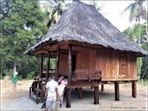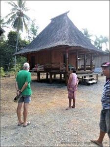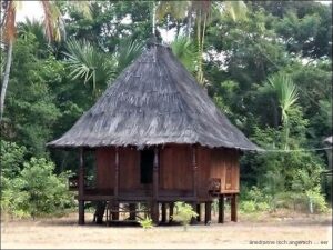 Um neun fahren wir weiter. Die Strasse hat teilweise tiefe Löcher und das Kamel wird etwas gefordert. Das nächste, größere Ziel ist Viqueque. Entlang der Straße sind aber unzählige, kleine Dörfer zu finden. Viele der Häuser sind noch in traditioneller Bauweise, mit Bambus und Grasdach gebaut. Allerdings fällt auf, dass unzählige neue Steinhäuser angefangen sind, was wir etwas schade finden. Gegen Mittag suchen wir nach einem Warung um zu essen, finden aber keinen. Dafür finden wir die Queen eines Dorfes . Ihre Häuser fallen auf und wir fragen um die Möglichkeit zu fotografieren. Heinze hat schon gesehen, dass ein Mann ihr die Hand geküsst hat, darum wendet er sich an sie. Als Queen Alexandria stellt sie sich vor, ist die Königin des Dorfes, sehr selbstbewusst und bestimmt und genehmigt Bilder.