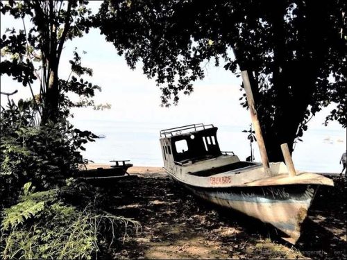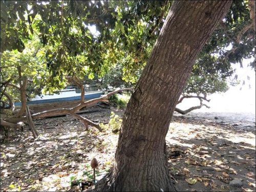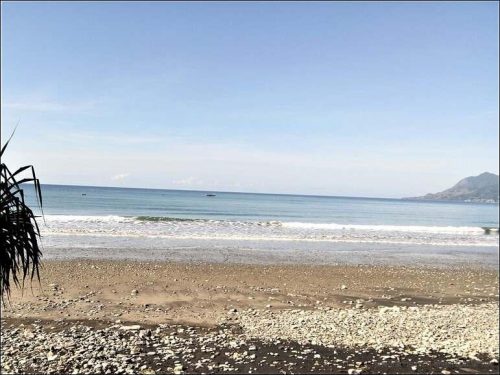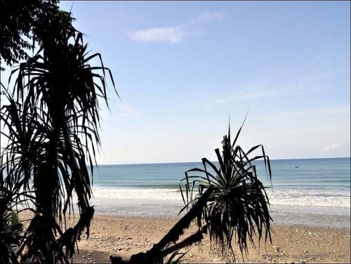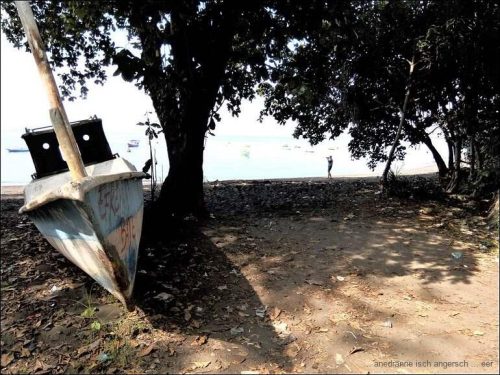 Die Infrastruktur ist aber der Neuzeit angepasst, so dass die Satellitenschüssel hinter dem Haus dazu gehört. Um halb vier brechen wir auf und beginnen mit der Suche nach dem Übernachtungsplatz. Es ist dann aber wie verhext, keine Warungs, keine Zufahrten zu den Häusern, – die Leute haben auch keine Autos. Wir fahren und fahren. Schliesslich sind wir wieder am Meer. Auch hier, keine Zufahrten zum Strand. Erst am Pantai Batu Biru (Blue Stone Beach) führt ein schmales Strässchen zum Wasser.