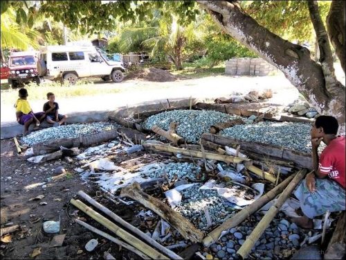 Steine, farblich getrennt, werden am Strand gesammelt und verkauft.
