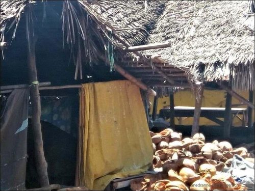 Ein wohl wichtiger Erwerbszweig der Dorfbewohner ist die Salzgewinnung. Hier wird Meerwasser zu Salz verkocht. Geheizt wird mit Kokosschalen. Von denen hat es genug.