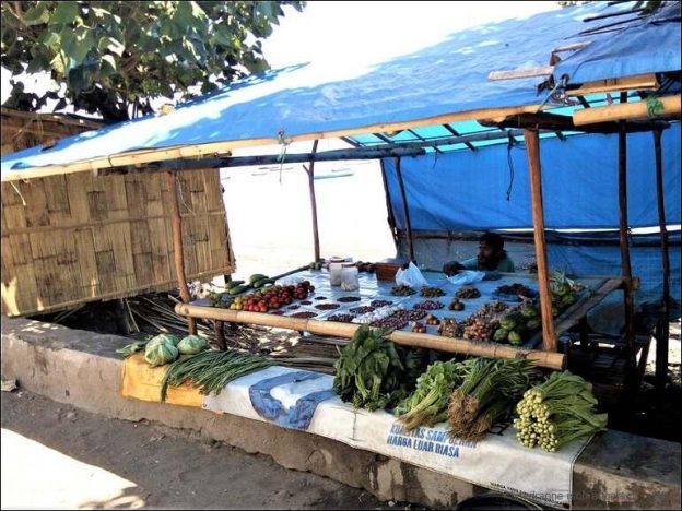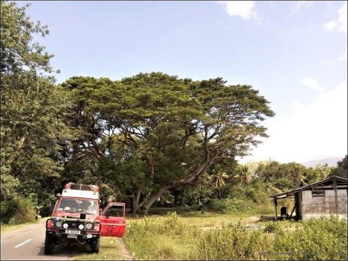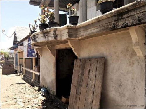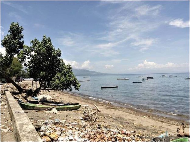 Wir frühstücken heute um acht im Budi Sun. Bis halb zehn zieht sich dies hin. Danach packen wir zusammen und verlassen diese wunderbare Unterkunft. Bevor wir fahren können müssen wir noch die Einzelteile der Reserverad-Aufhängung an der Stoßstange befestigen. Mit Hilfe einer Bambusstange ist dies auch gut möglich. Spanngurten erledigen den Rest. Um half elf fahren wir weiter Richtung Larantuka. Bis dahin sind wir lange unterwegs. Die Straße führt über grosse Strecken dem Meer entlang. Zwischendurch müssen wir anhalten um gute Fotos zu machen. Heinze ist wieder in seinem Element. Die Schockphase vom Zusammenputsch ist etwas verarbeitet und überwunden. Zwischendurch kaufen wir Bananen ein. Trotzdem sie grün sind, schmecken sie wunderbar süß und köstlich. Allerdings finden wir keinen Warung oder ein Restaurant. Übrigens die ganze Strecke nicht. Edi entwickelt sich zum Bananenfresser. Hoffentlich hat dies keine Nebenwirkungen. Erst etwa um 16 Uhr sind wir in Larantuka und haben da einen wunderbaren Warung entdeckt. Das Essen schmeckt köstlich. Sogar eine Art Supermarkt finden wir, und kaufen da noch das Nötigste für die morgige Fährenschifffahrt ein. Anschließend fahren wir wieder aus Larantuka raus, zur Fährenanlegestelle. Hier richten wir unseren Übernachtungsplatz ein.