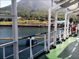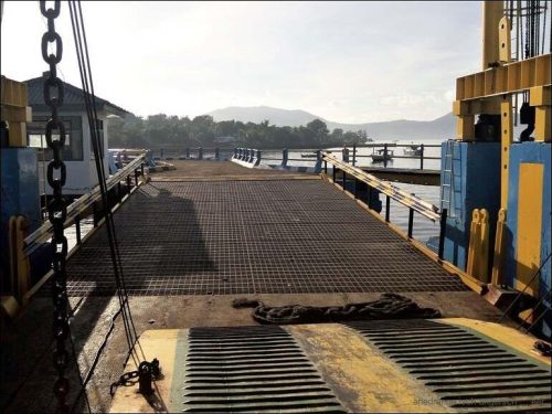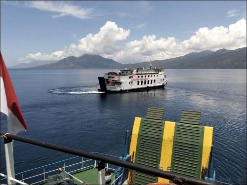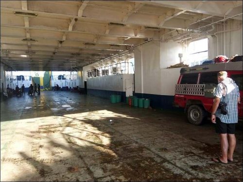Wir stehen früh auf, um fünf Uhr dreissig klingt das Handy. Im Hafen ist aber schon lange Betrieb; – überhaupt war der Hafen nur so um drei Uhr etwas ruhiger. Die meiste Zeit war ein Höllenlärm und an schlafen war nicht zu denken. Am Abend waren unsere Fahrzeuge die Attraktion der vielen kleinen und grossen Kinder. Wir machen Kaffee und räumen unseren Schlafplatz. Auch am Morgen ist es anscheinend immer noch interessant uns zu beobachten. Um sieben Uhr holen wir uns unser Ticket für die Fähre und können dann gleich auf das Schiff fahren.