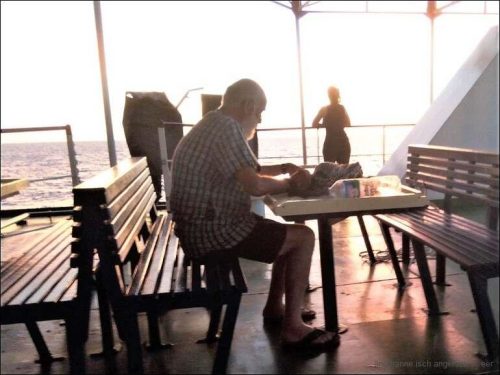 Nach zweimal drei intensiven Hornstössen setzen wir uns in Bewegung Richtung offenes Meer. Morgens um eins sollen wir wieder anlegen. Die Fahrt verläuft ruhig und eintönig und es schaukelt ganz schön. Wir gönnen uns einen Becher Fertignudeln vom Schiffskiosk zum Mittagessen. Das hätten wir aber besser sein lassen. Beiden wird übel. Also legen wir uns im obersten Deck auf die Bänke, so ist es erträglich. Wir schlafen und lesen viel. Internet gibt es nicht.