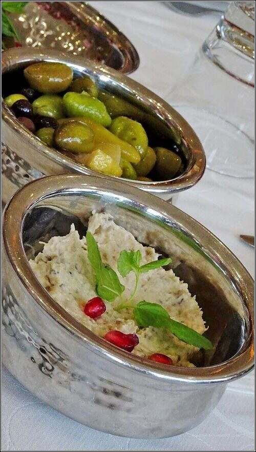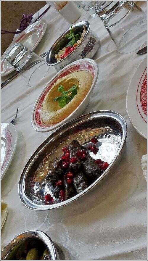 In Jerash göh mer o gah zmittag ässe. Das wislet u täselet da um üse Tisch ume. Chällner um Chällner bringe Schüsseli, Tällerli, Näpfli u alli si mit de köschtlechschte Spyse g’füllt. Teigtäschli mit G’müesli u Chrütli, Wybletter, o wieder g’füllt, Hummus, Quark, Salät, G’mües u derzue früsch’s Fladebrot. D ‚Roubtier‘ berchöme Spiessli mit Huehn u Schaf, – aber i g’seh meh als g’nue für mi u kenne dervo nid d Hälfti.