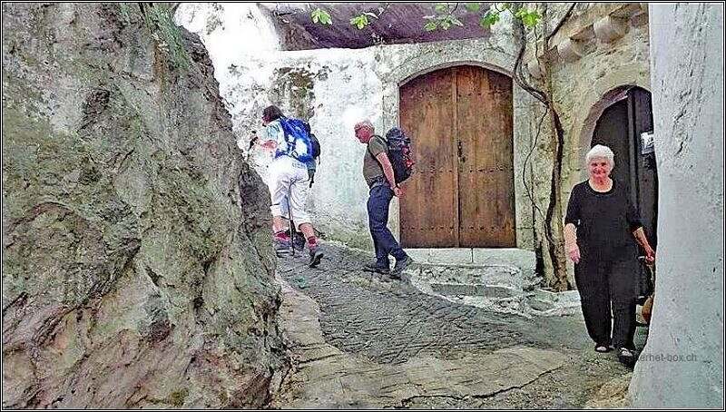 Kostas der Fahrer chauffiert üs nach Meronas. Das isch veiechli es Fährtli. Meronas isch es Strassedörfli i de Bärge, fasch i der Mitti vo Kreta. Vo dert geit es de z Fuess stotzig der Hang düruf. Üse Wäg geit zersch dür ds Dörfli, begleitet vo bällende Hünd u dernah zwüsche Dornebüschli düre. Ds Ziel isch ds Kapälleli obe uf em Bärg. Wiu mi Chilche nid so interessiere, weiss i nid mal me, wie die g’heisse het.