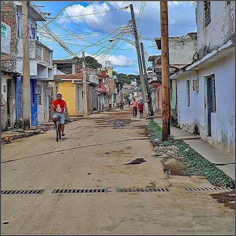 Es isch heiss hüt. Drum bruche mer scho chley Zyt. So um die drü göh mer i d Stadt. Mer si i me Beriich, wo mer bis itz nie si g’sy. Es isch ärmer hie, – het weniger casa particular. Trotzdäm g’seht me o schöni Egge. U Lüt wo eim nid nume ab’bättle begägnet me o. Aber, – es geit de Lüt gar nid rosig.