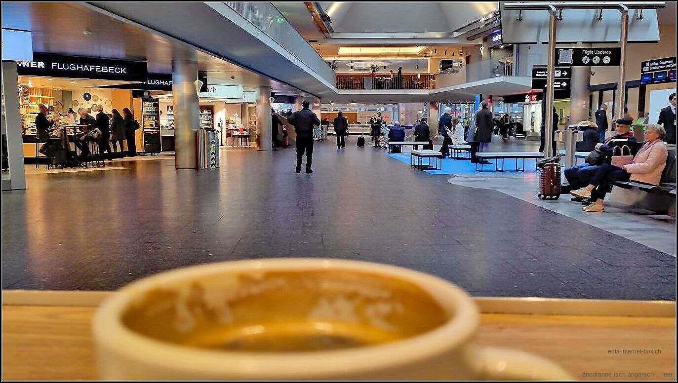 Spitze isch hüt ds Zytmänätschmänt g’sii. Ha geschter chönne i checke, dür das ha n i hüt nid müesse a stah. Ds Züri isch nöi bim Check-In 3 e grosse Beriich, zum ds Gepäck sälber ufgäh. Toll. Fründlegi Lüt hälfe, we n es Frage git. Het derfür für g’nue Kafi g’längt. Guet, g’wartet ha ni de trotzdäm, bis zum Abflug.