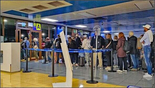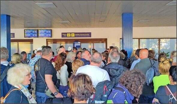 De faht ds Warte a! Drü Stund warte die Schwizer hie. Vieli vo ihne si i dene Hotälburge g’sii in Varadero. Teil Chöpf chöme mer sogar bekannt vor. Nach unändlech länger Zyt stah, wärde d Tourischte i Sächsergruppe i ds Flughafegeböid iche g’no (ichecke, Gepäck ufgäh, Sicherheitskontrolle usw.)