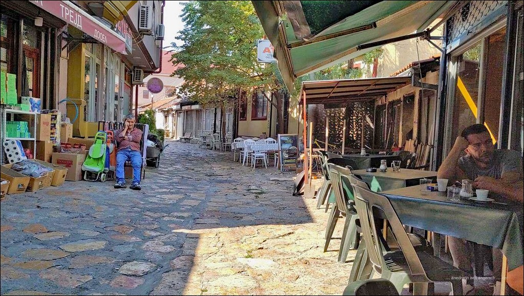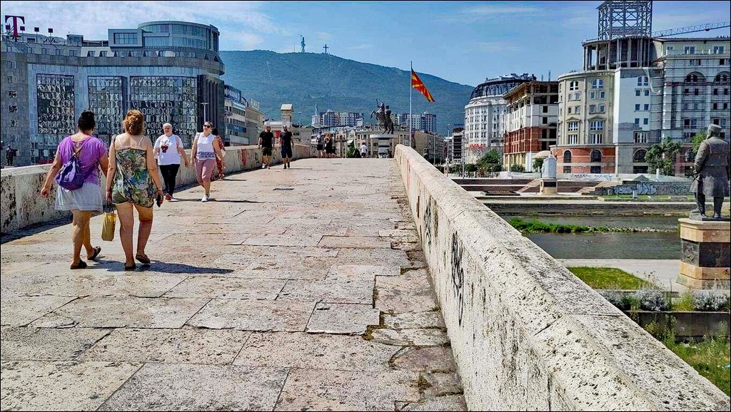 Vom Märit us füehrt üs die alti Steibrück diräkt über e Vardar i anger Teil vo der Stadt. Mer loufe drüber, göh aer nid sehr wyt. Dä Teil hie isch Mazedonisch u d Hüser si nöi. I merke, dass Memedis lieber uf der angere Site, bi de Albaner si. Mer wächsle also nach ere Stund wieder d Flusssyte. Vo dert us mache mi wieder allei uf. I gah zu der alte Stadtfeschtig ueche.