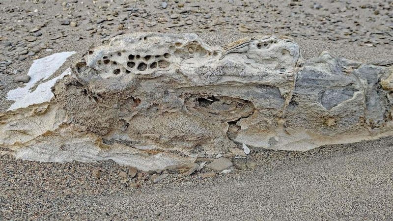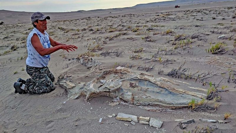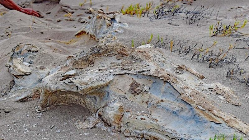 Mi düecht, är wüssi ’s‘ o nid so genau … die erschti Strass zu de Chnoche fingt er nid, d «Chosefina», wo chönnt hälfe isch nid daheim, also fahre mer wyter. Irgend einisch halte mer de, u loufe i d Wüeschti. Scho währed der Fahrt merke n i, dass dä Raphael e faszinierte Hobbyarchäolog isch. Hie i dere Wüeschtesänki fingt er es urtümlechs u versteinerets Walskelett. Ifrig faht er a, der Sang wägwüsche, dass mer d Grössi vo däm Tier chöi ermässe. Es isch beidruckend.