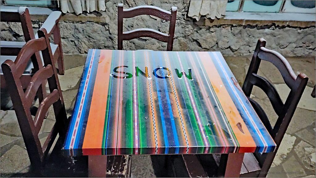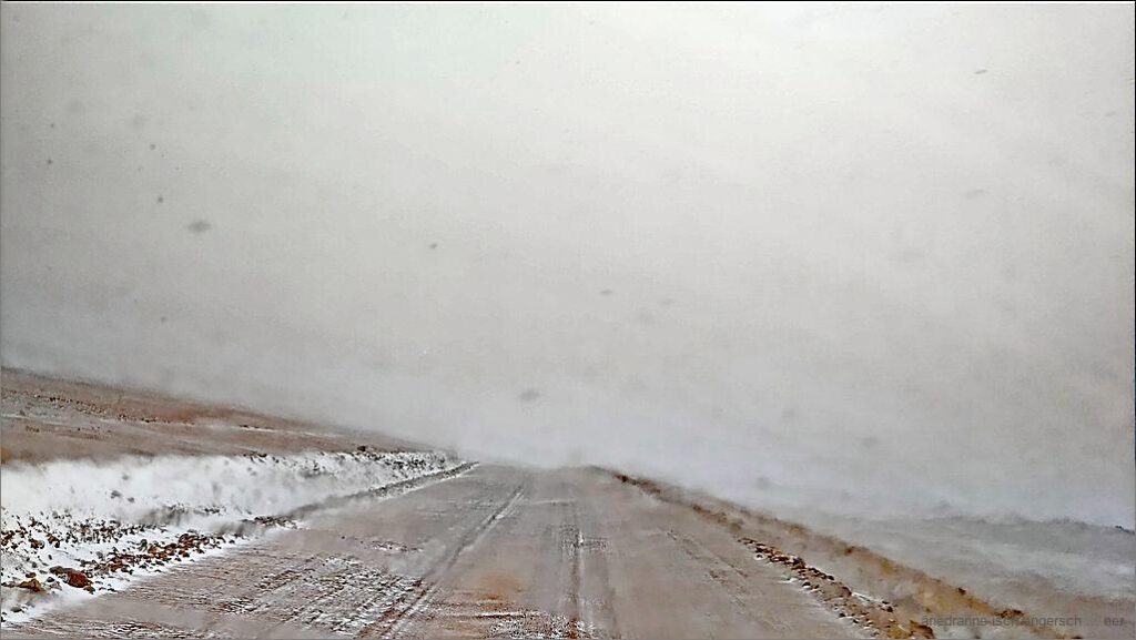 Schneesturm vom Strübschte. A g’strängt stiere mir zwe dür d Frontschibe. Währed em Fahre g’seh mer mängisch eifach nume no wyss. Der Luft tribt der Schnee i Stübete über ds Land. Am Strasserand git es Wälme un es wird schwierig sech z orientiere. Mer fahre oder düssele, chrütze mehreri Outo u chöme de Irgendeinisch im Refugio el Alto a. Ds Doppuzimmer a 50$ u es Znacht i Ussicht. Ds Uslade vom Nötigschte isch e Tortour. Chalt-chalt-chalt u nass.?