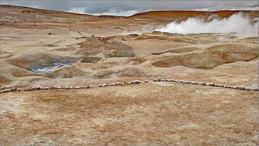 Geisire stige kener. O nid nach drüviertel Stung. D Löcher, wo die Vulkanhitz usechunnt, itz nume i Form vo Dampf, si aber o sehr interressant, farbig u i de skurilschte Forme.