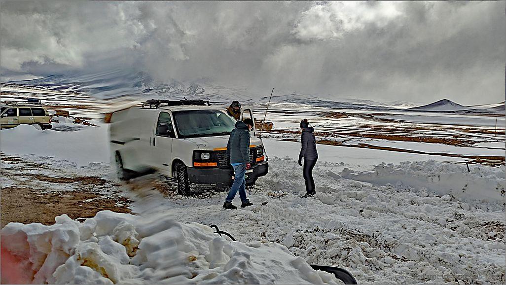 Mir si übrigens nid die einzige Schwizer hie. D Bettina u der Pascal si mit ihrem GMC o hie g’strandet. Gmeinsam loche mer die Chäre us em Schnee. Das duret de g»rad vom Vormittag bis am Nami em zwöi. Chalt, nass- nass chalt!