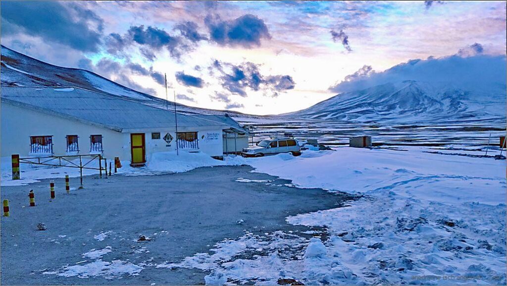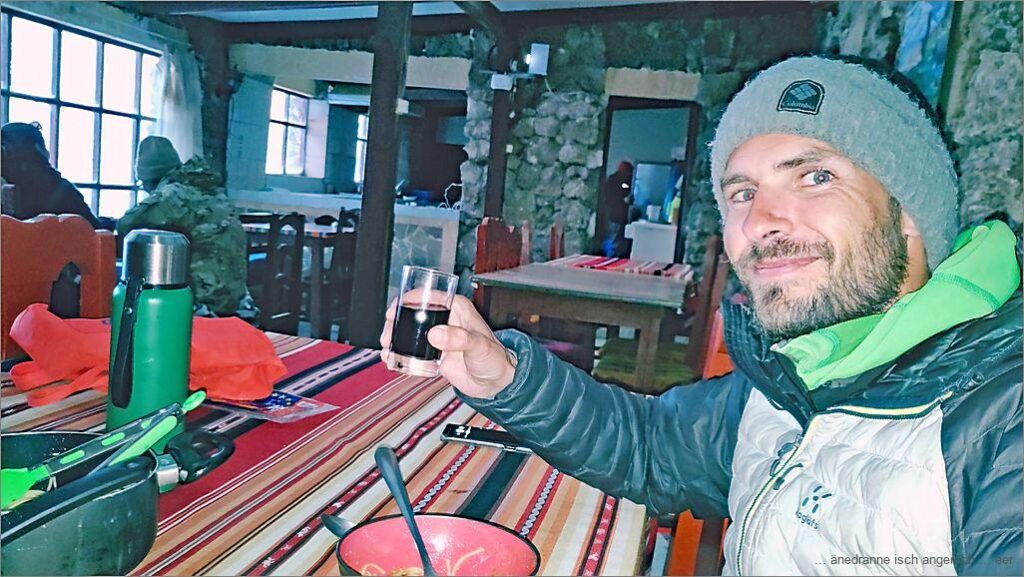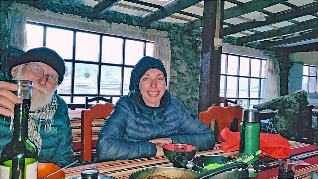 Hüt isch der zweit Tag im Refugio el Alto. D Sunne schynt, aber der Luft geit starch, was am Hus waggelet, macht o Lärme. Mer nähme’s g’müetlech u göh’s ruehig a. D Hoffnig, hüt nach Chile übere z fahre isch gross. Mer zmörgele z viert u mache de d Outo zwäg. Mer rume ds Zimmer u wäre parat für d Abfahrt. Heinz seit:»Am Viertu vor elfi fahre mer ab»!