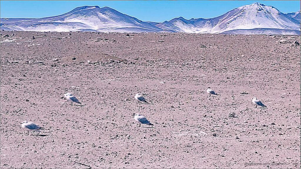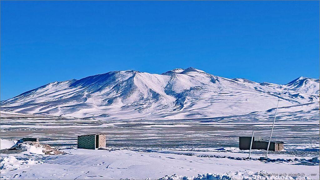 Nume, zu de Chilene chöi mer nume z Fuess. Zwüsche der Passkontrolle u der teerete, chilenische Strass türmt sech e Riesehufe Schnee. Vom bolivianische Schnützemaa hei mer nümm g’see oder g’hört.