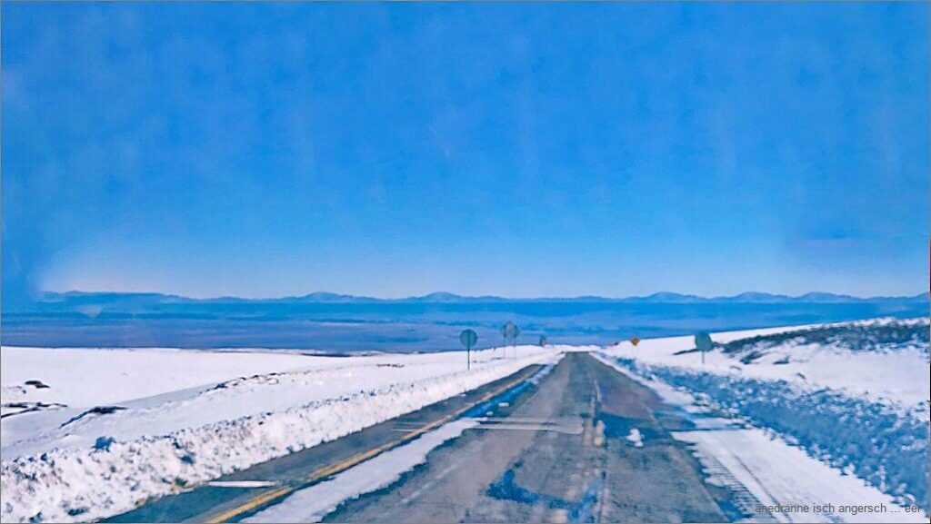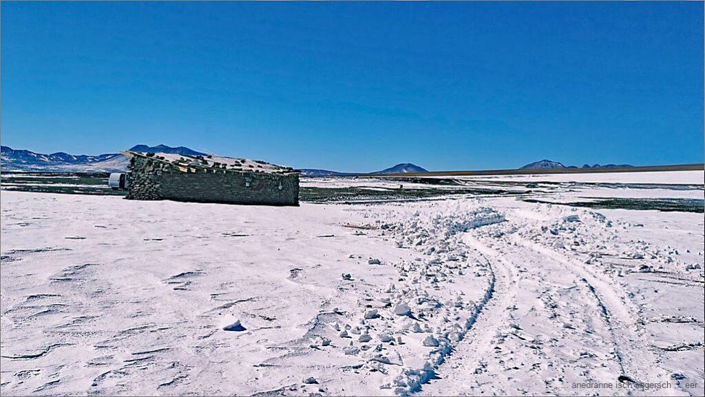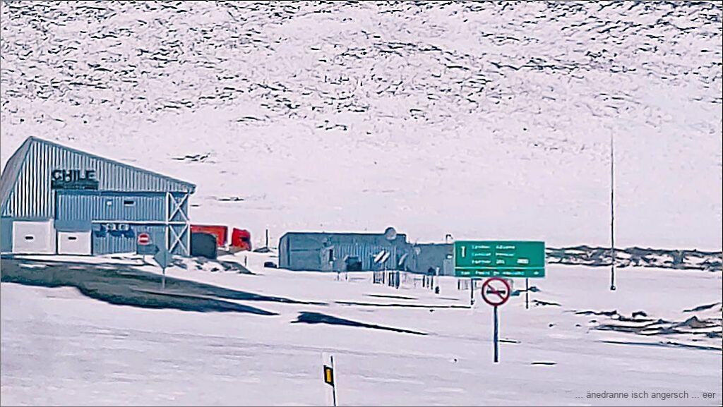 Es isch öppe nüni, wo n ig afah, mit der Toiletteschufle e Wäg für d Outo z schufle. Bim ordentleche Gränzübergang geit das nid. Wyter der Bärg düruf liegt aber weniger Schnee. Mit vereinte Chräft u zwene Schufle g’lingt es üs, bis am eis e Wäg z schufle bis uf d Strass nach Chile. Vo Bolivie berchöme mer ke Hilf. «Me heig ke Disel meh für d Schneeruummaschine». Was söll’s!