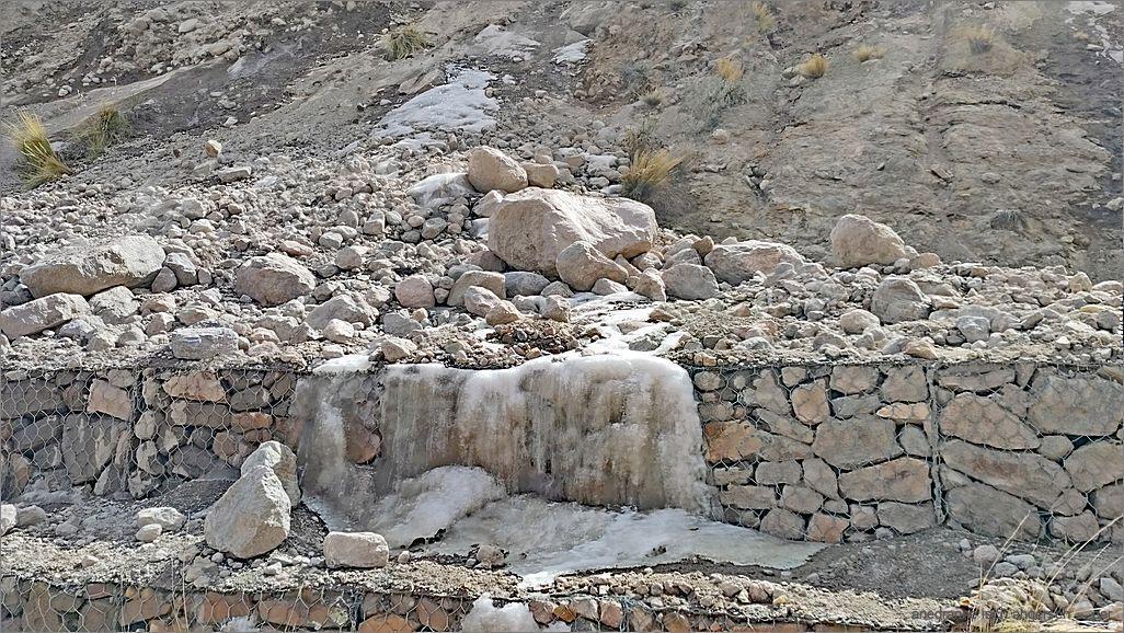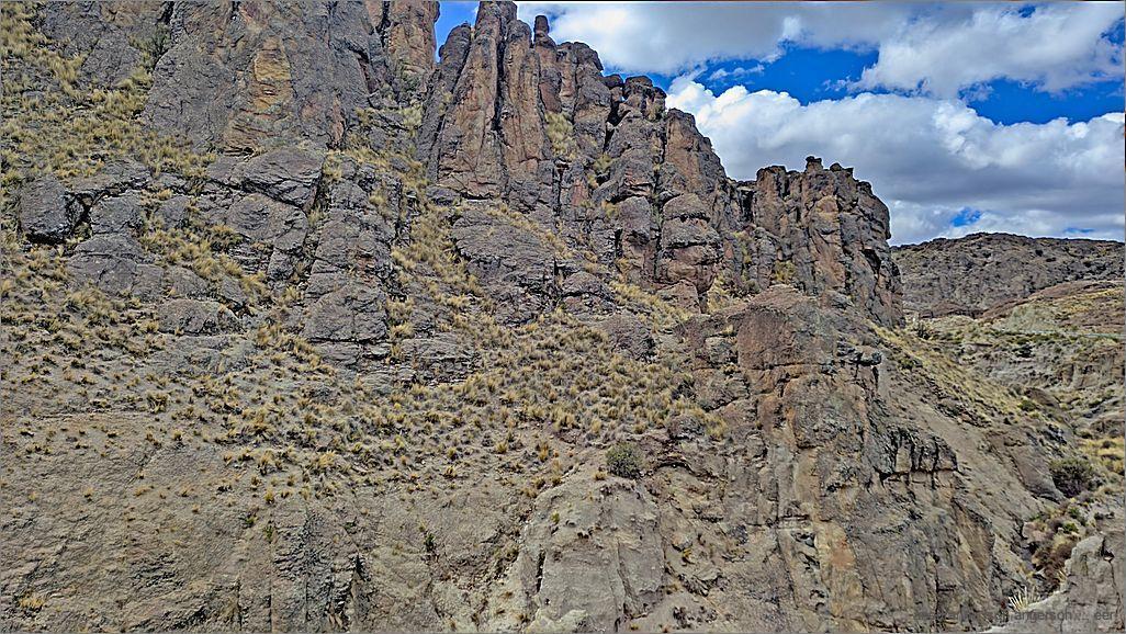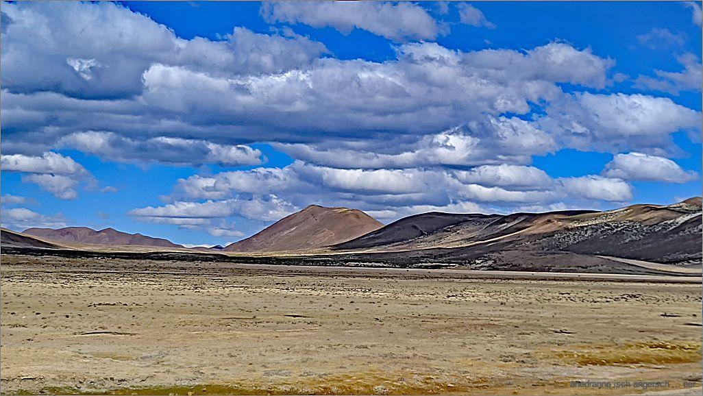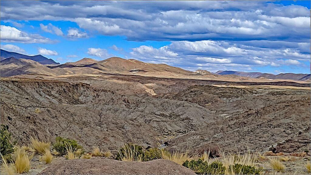 Mer fahre dür Täler, mit ung’wohnt eigetümleche Formatione, uffälliger Vegetation u begägne immer wieder südameriksnische Kameli. Möntsche g’seht me nid viel. Vieli Hüser u Siedlige entlang der Strass si läär u verg’heie. Mer vermuete, dss sech d Lüt irgendeinisch i grössere Dörfer zämeg’schlosse hei. Chaquilla isch so es Dorf, em Rand vo re riesige Äbeni. Ir Rägezyt het es hie e See. Itz si unzählegi, grossi Lamaherde hie wo grase.